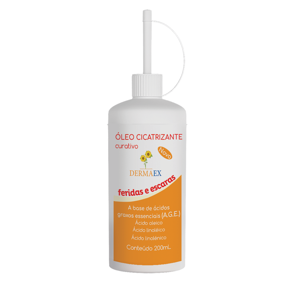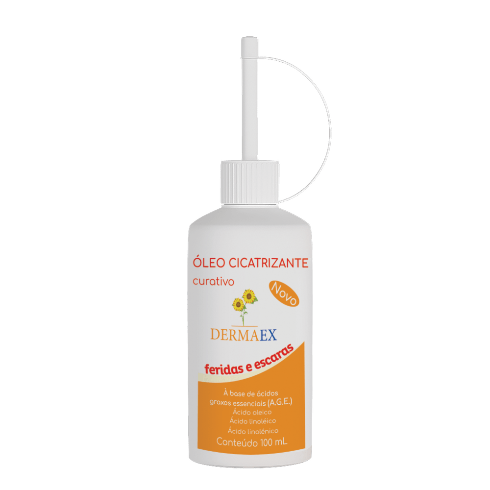 O Óleo Cicatrizante Curativo Dermaex é um produto à base de ácidos graxos essenciais (AGE) e triglicérides de cadeia média (TCM). Em sua composição contém óleo de girassol, vitaminas A e E, ácido linolênico, lecitina de soja, óleo de soja e ácidos graxos essenciais. Esta associação tem a capacidade de auxiliar na cicatrização de feridas, principalmente pela hidratação da lesão, pois o AGE proporciona maior nutrição e oxigenação da pele e por criar uma camada graxa forma uma película impermeável a água e permeável a gazes, protegendo a lesão contra a invasão de microorganismos, agressões físicas e químicas e cria um ambiente (umidade e temperatura) ideal para a angiogênese e quimiotaxia responsáveis pela cicatrização.